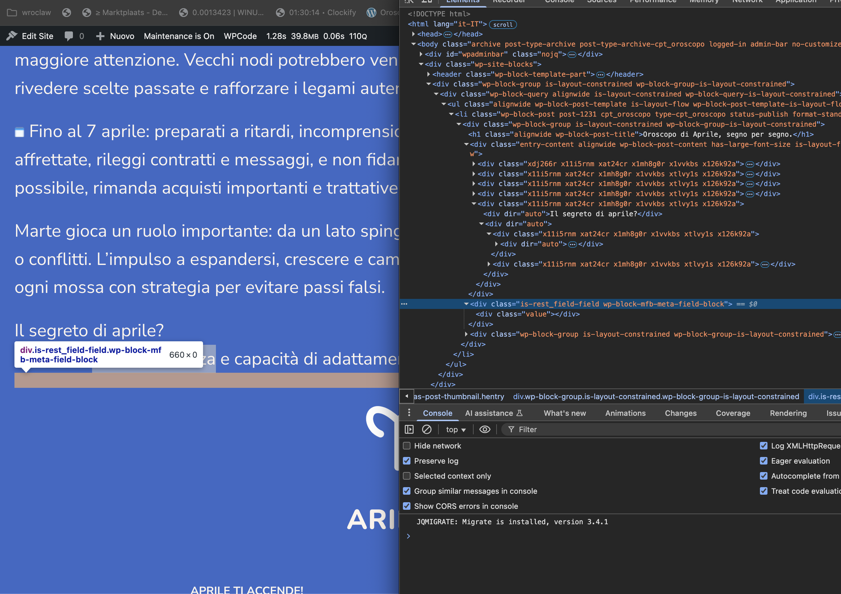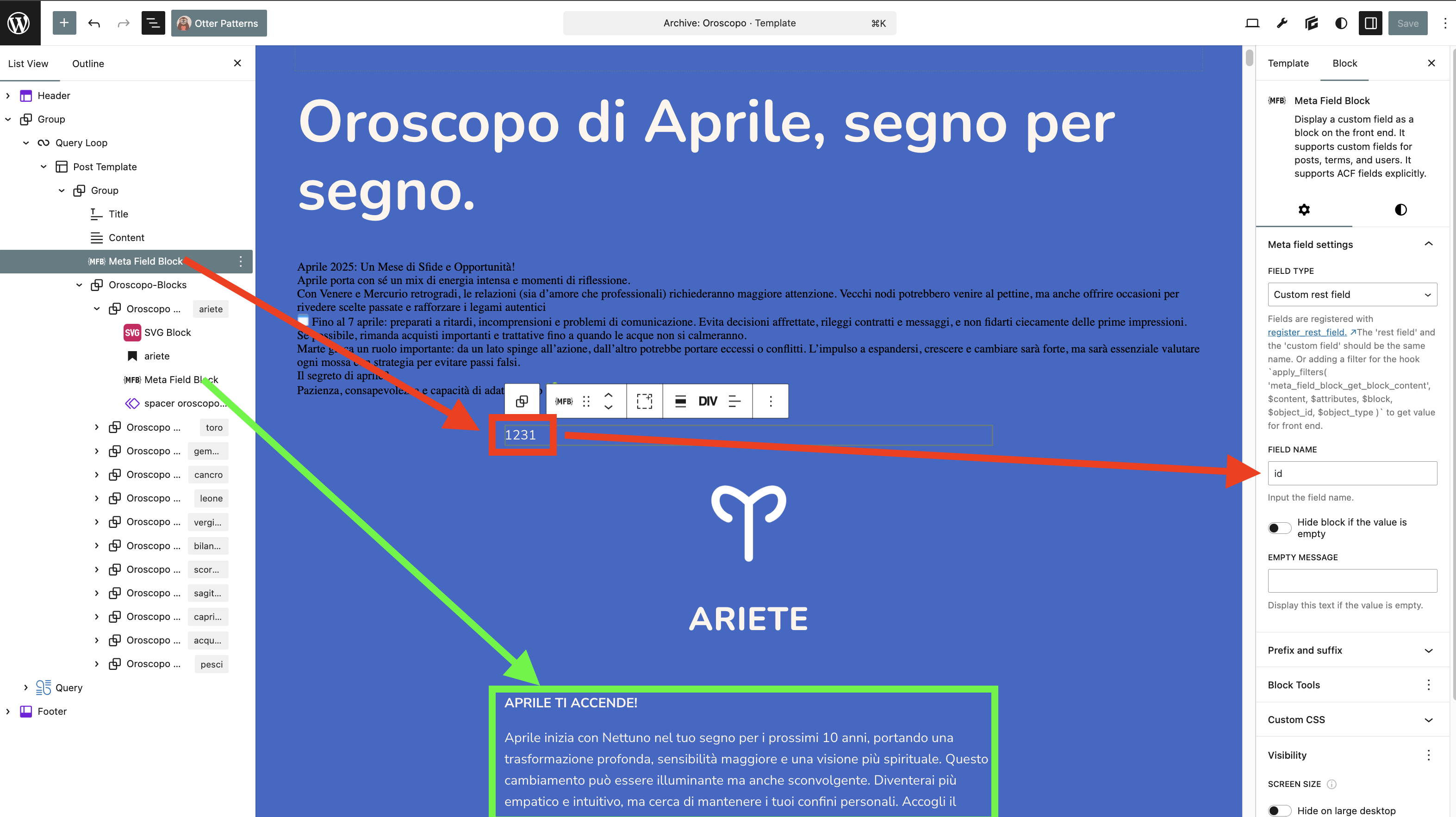 here a view of the FSE window, in the image the selected block is set to pull the ‘id’ field from the rest api and properly does so: