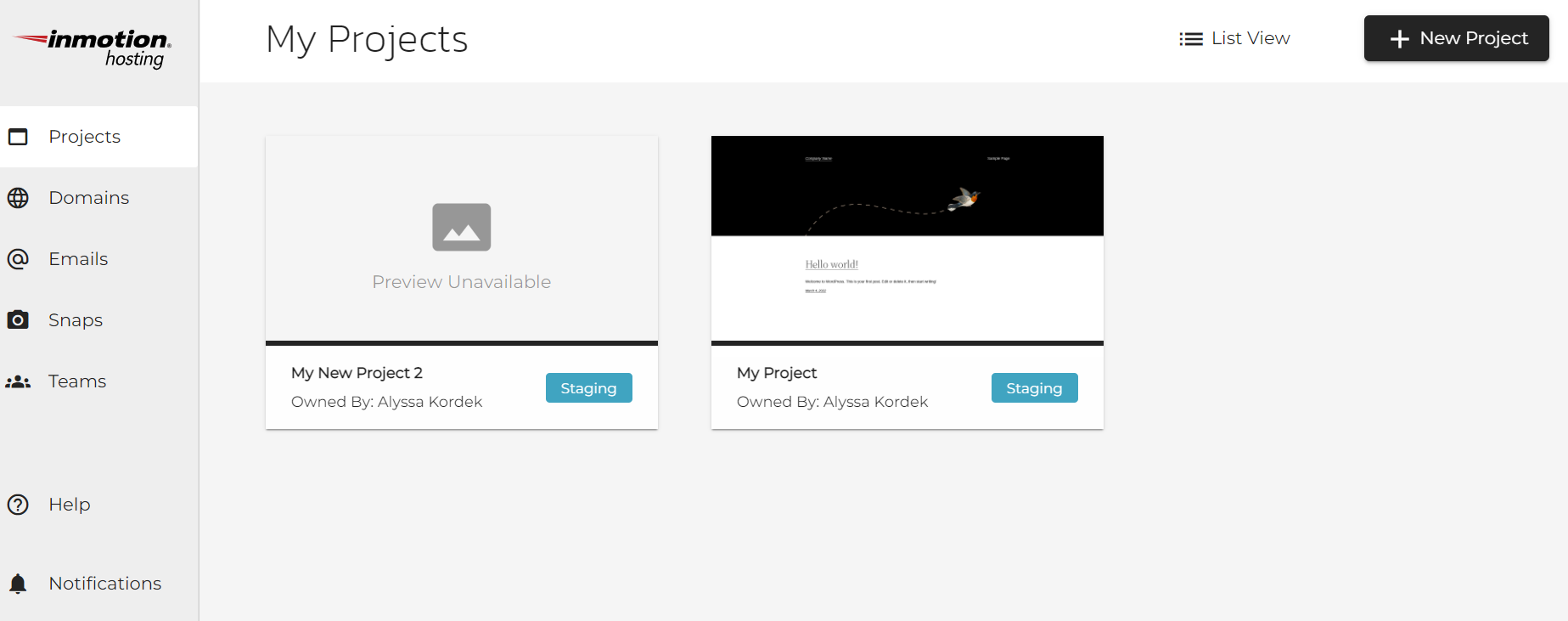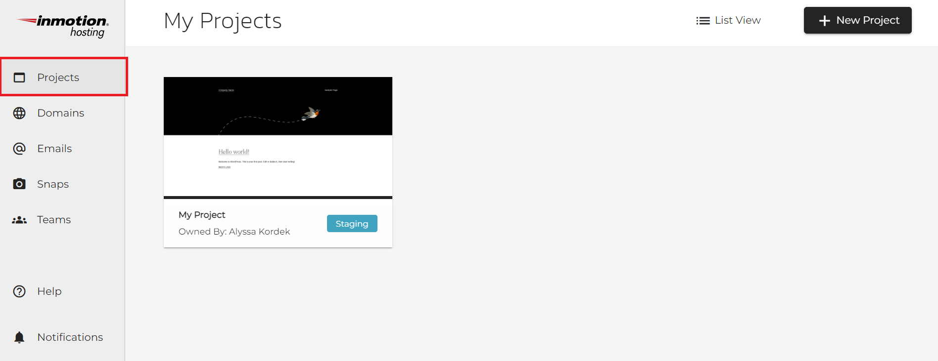 - If you’d like to create a new project, click the New Project button on the top right to create a new site in the InMotion Central dashboard. This will then walk you through the setup process for another WordPress site.