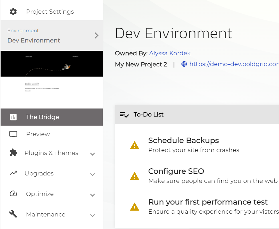 - To manage a different site, simply click the Projects tab again and click The Bridge on the tile corresponding to the site you wish to modify.