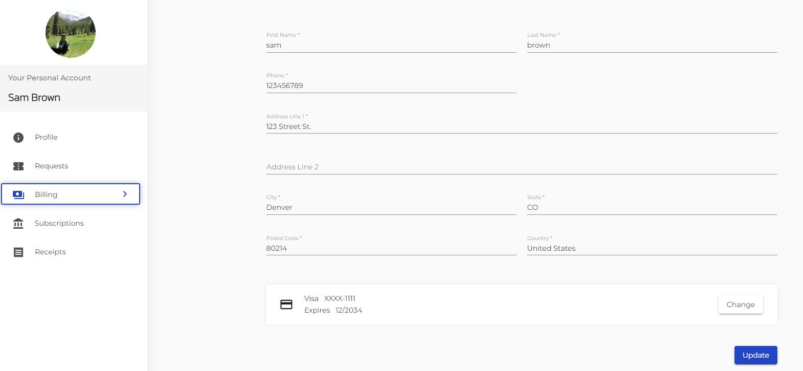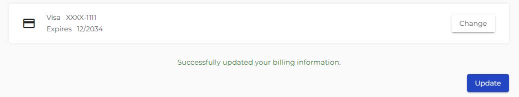 - To change your billing contact information, edit any info you need to change, then click Update. Once done, you will see a message under your credit card info that says Successfully updated your billing information.