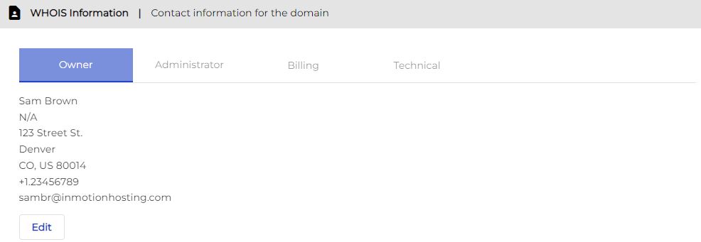 - Scroll down to the WHOIS Information section, select the tab for which information you want to edit (Owner, Administrator, Billing, or Technical) then click Edit.