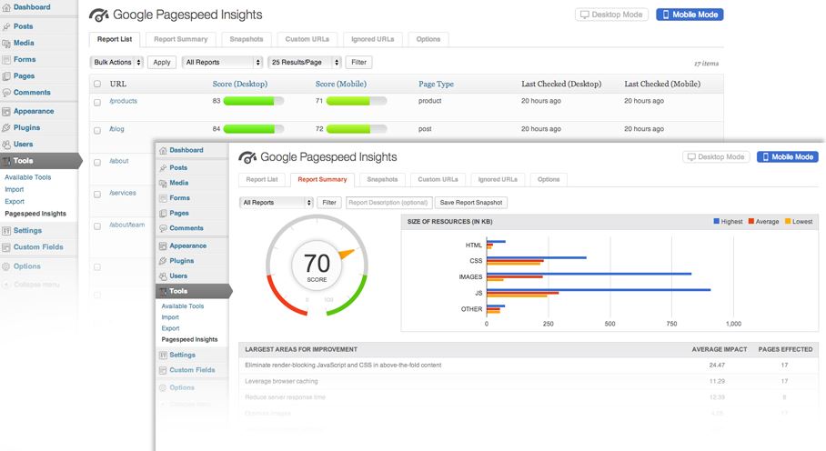 This plugin brings the full PageSpeed tool experience directly to your site. It provides a comprehensive solution for any webmaster looking to increase their site performance, their search engine ranking, and their visitors’ browsing experience.
